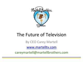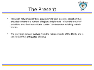 The document discusses the present state and drawbacks of television distribution methods, including broadcast TV, cable TV, and satellite TV. Broadcast TV relies on terrestrial signals transmitted from central stations to regional affiliate stations, but maintaining transmission towers is expensive. Cable TV transmits signals to homes via cables connected to receiving towers, but maintaining the cable infrastructure and paying franchise fees to municipalities is costly. Satellite TV transmits signals directly to home receivers via satellites, but operating and maintaining the satellites is expensive. As a result, cable and satellite providers charge subscription fees to viewers to cover infrastructure costs.