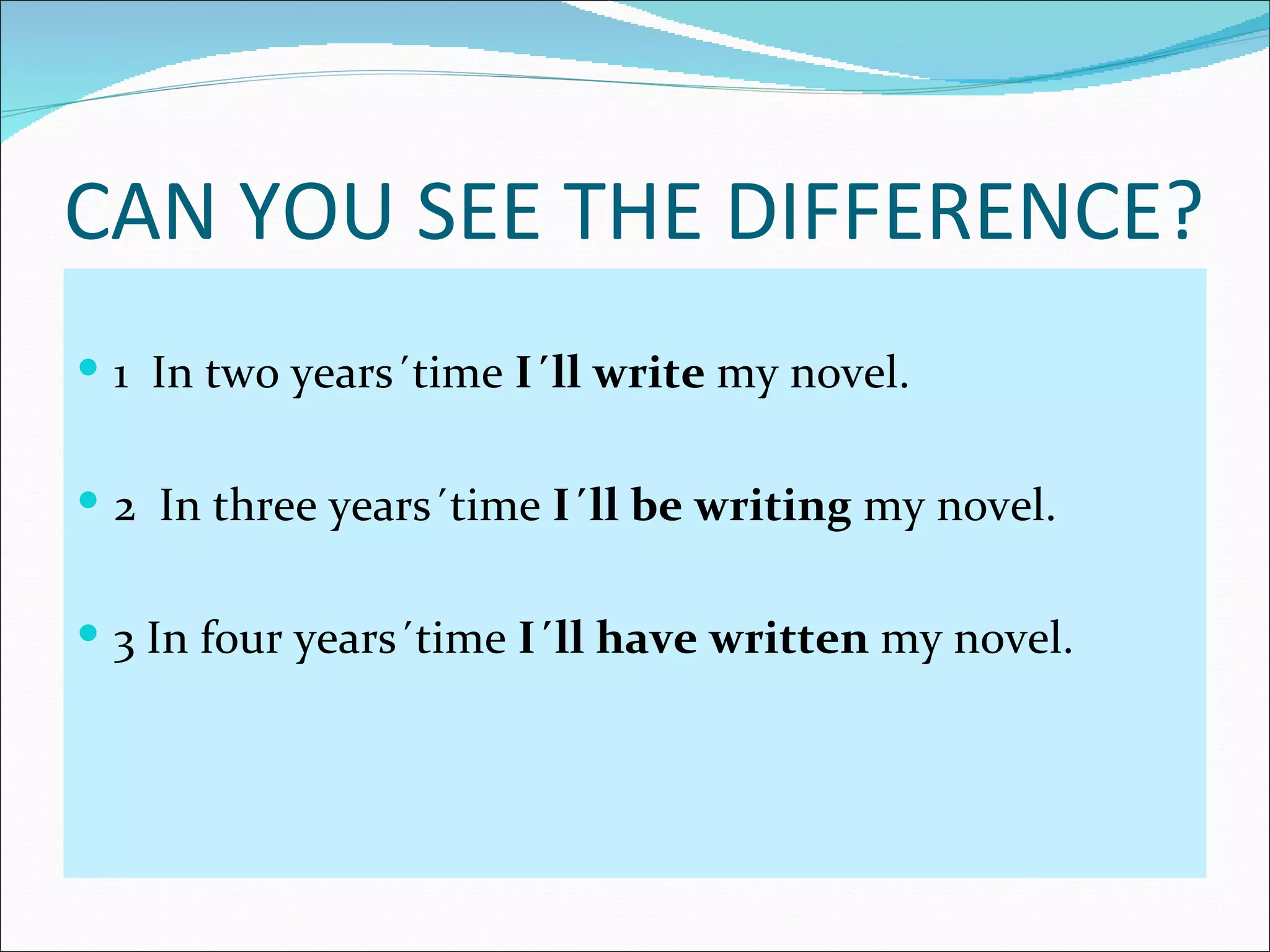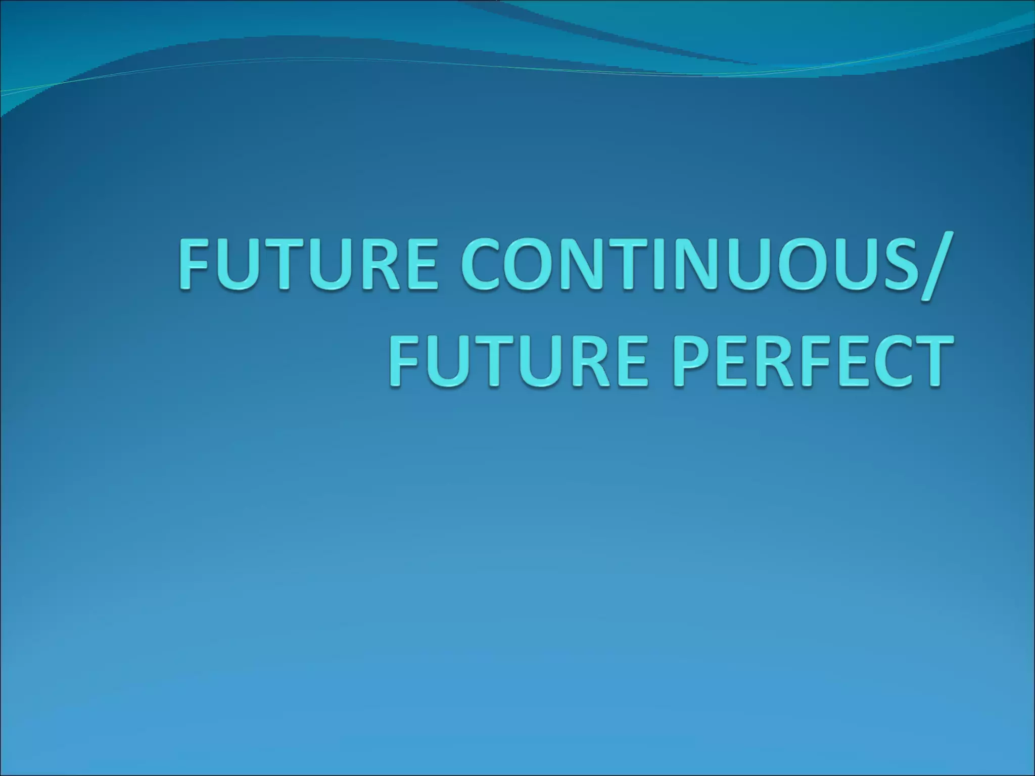 This document discusses the future continuous and future perfect tenses in English. It provides examples of how to use each tense, including sample sentences using verbs in brackets that are filled in to demonstrate the tenses. Exercises are also included for readers to practice forming sentences using the future continuous and future perfect tenses. Key differences between the tenses are that the future continuous describes an action that will be in progress at a specific time in the future, while the future perfect describes an action that will be completed by a certain time in the future.