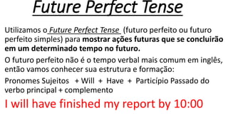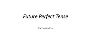 The document discusses the future perfect tense in English. The future perfect tense is used to refer to actions that will be completed by a certain time in the future. It is formed using will + have + past participle. Examples are provided of affirmative, negative, and interrogative sentences in the future perfect tense, along with common uses like talking about actions that will be finished by a certain time. Practice questions are provided at the end for readers to test their understanding of forming sentences in the future perfect tense.