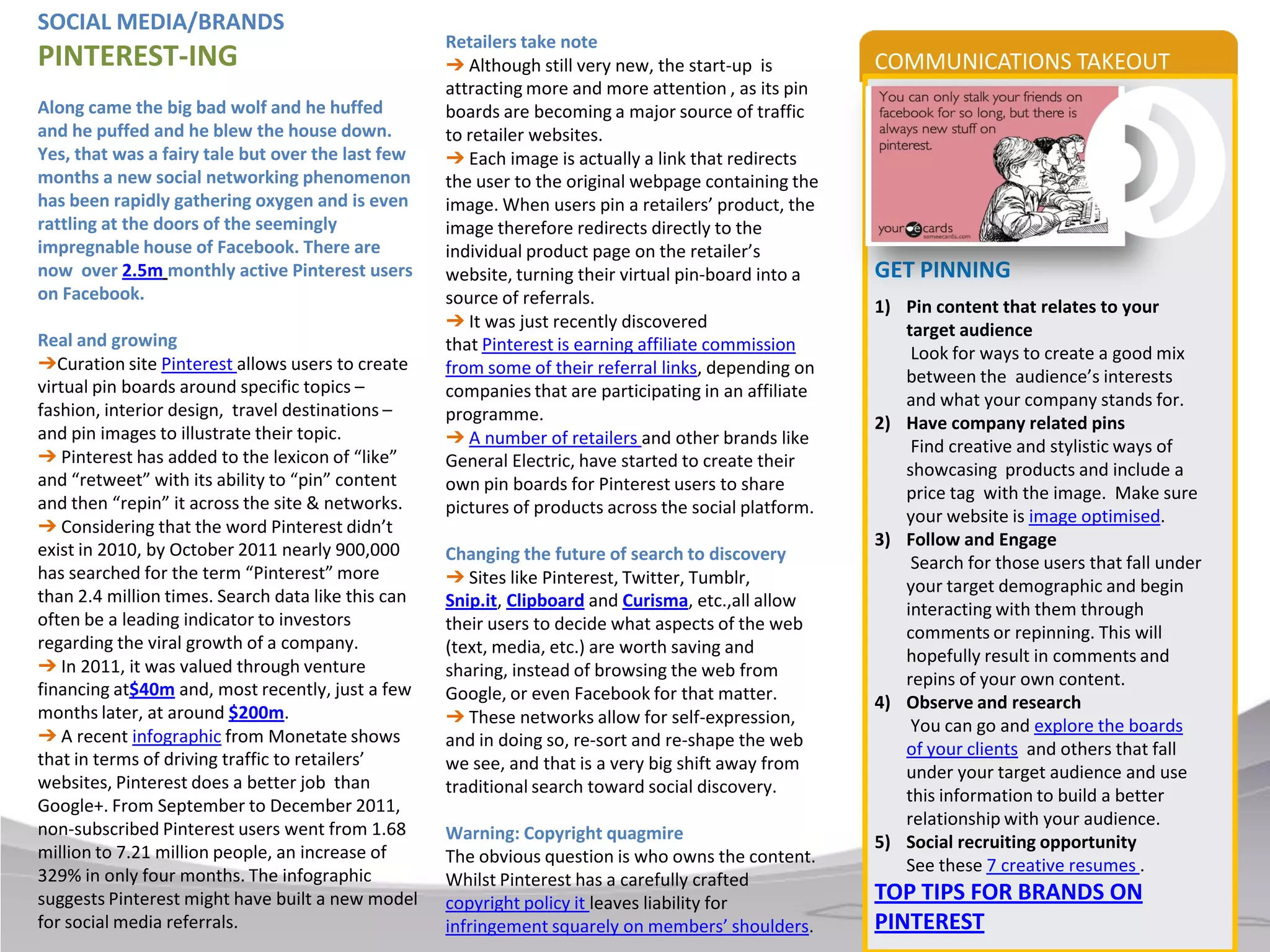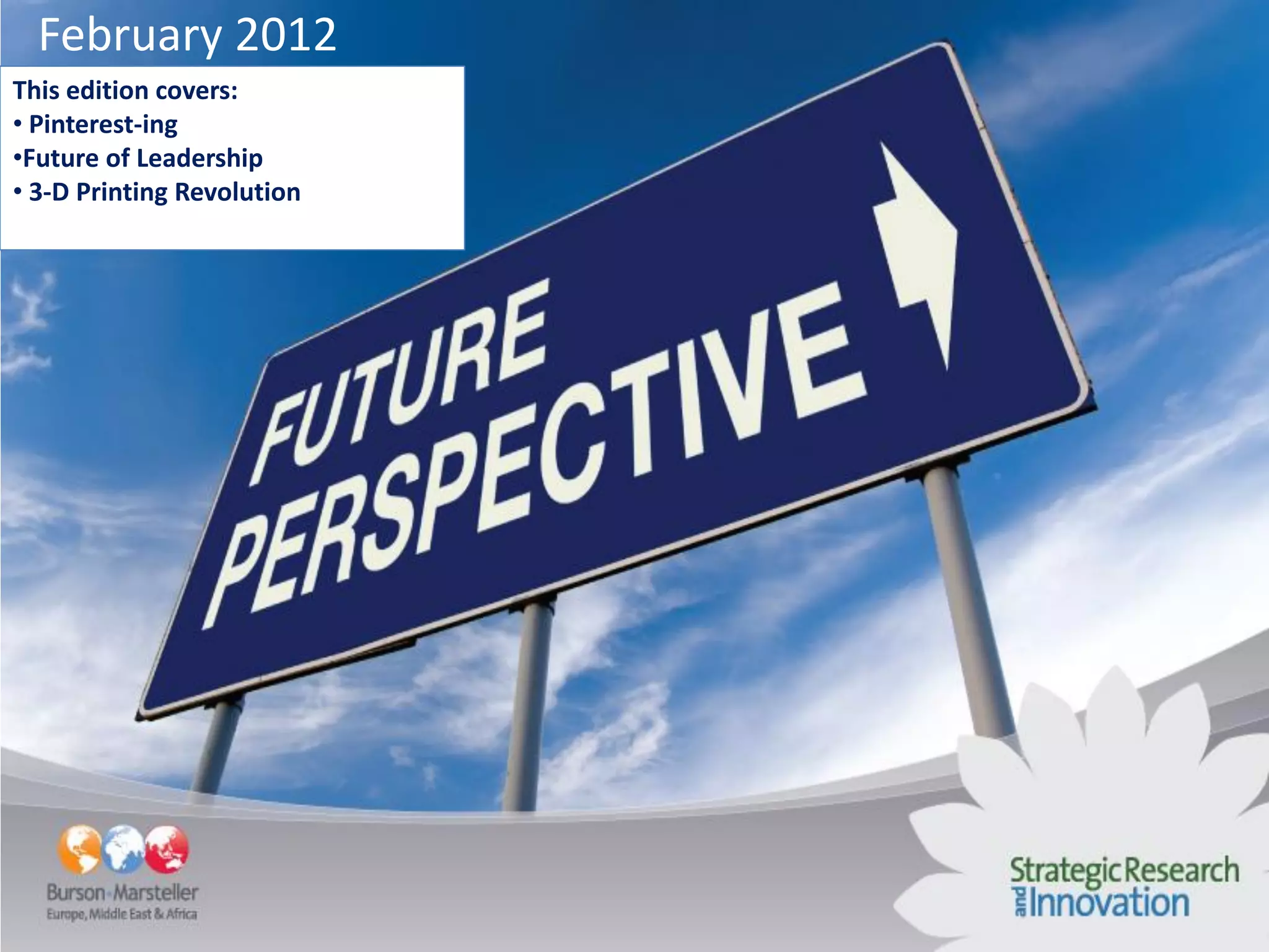 Pinterest is a social curation site that allows users to create virtual pinboards around topics. It has seen rapid growth, attracting over 2.5 million monthly active users on Facebook. Pinterest is becoming a major traffic driver for retailer websites as each pinned image acts as a link. Future leaders will need to be tech savvy, demonstrate ROI, and have strong ethics and transparency. 3D printing, also known as additive manufacturing, uses successive thin layers of material to print solid objects like medical devices and prototypes. It could transform manufacturing by lowering costs and allowing for customization. Intellectual property issues may intensify as designs can be copied more easily.