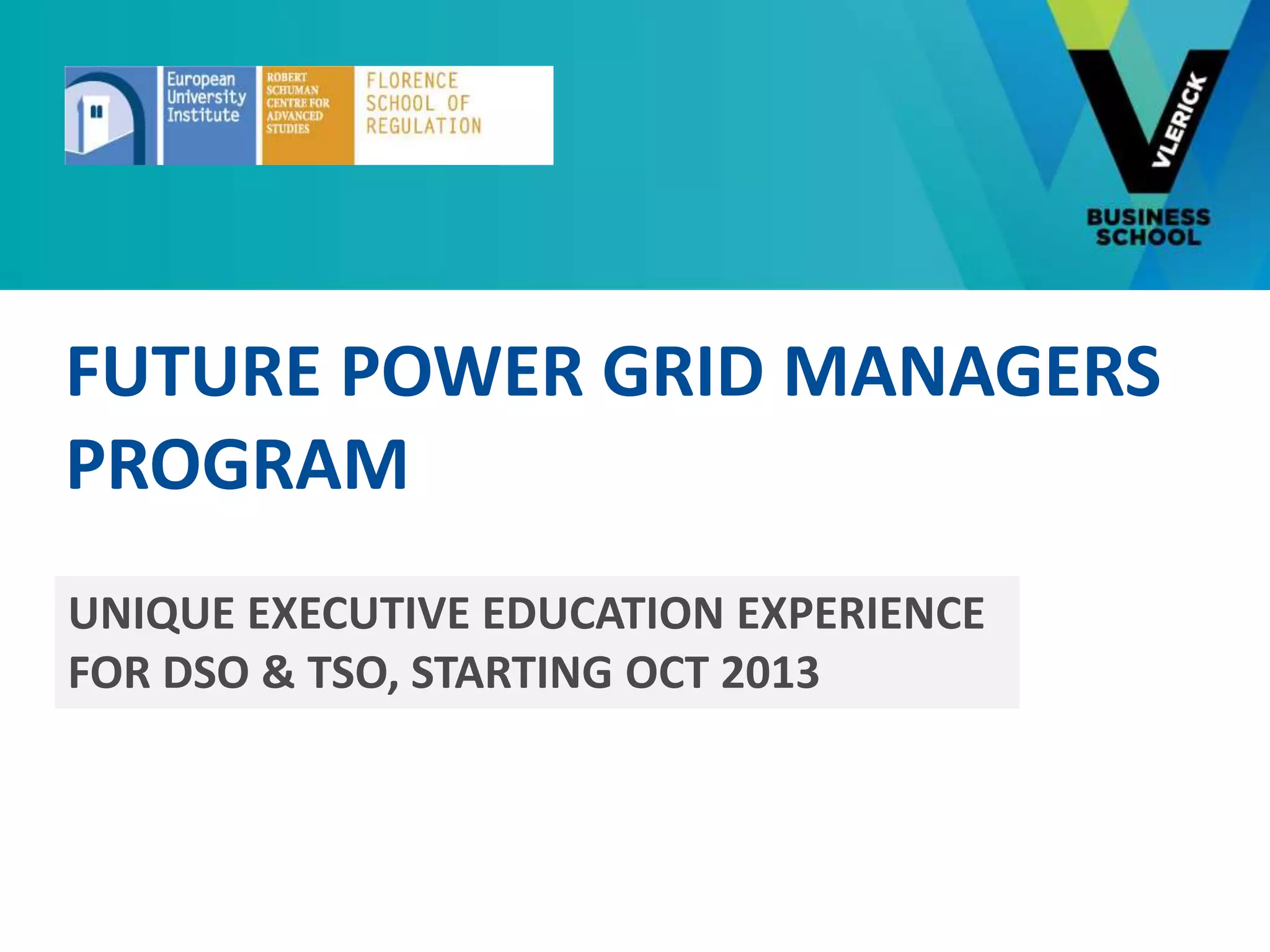 This document describes an executive education program on future power grid management offered by Vlerick Business School starting in October 2013. The 11-day program consists of 3 modules covering topics like EU energy regulation, future grid scenarios, business models and regulation, and strategic innovation. It aims to build a community of managers and help them broaden their vision. The program will be co-directed by experts from Vlerick and Florence School of Regulation. Participants will develop projects and the program fee is EUR 12,000 per participant, excluding accommodation.