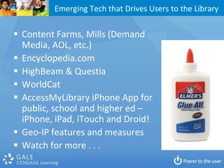 Stephen Abram presented on how libraries must change strategies to prepare for the future. He discussed how users, learning, mobility, and government have all changed significantly with technology advances. Abram argued that libraries need to focus on discovery, ideas, and being emboldened to create the future, rather than feeling like victims of change. He suggested strategies like knowledge portals, focusing on learning outcomes, and understanding new formats like e-books and streaming media. Abram concluded by urging libraries to attempt ambitious new strategies without fear of failure.