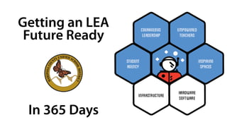 This document outlines the steps taken over 365 days to transform a school district from traditional practices to future ready practices focused on technology integration and innovative learning models. It summarizes the changes made between September 2013 and November 2014, including moving from thin WiFi to BYOD access, equipping labs and classrooms with newer technology, implementing 1:1 devices for students, and training teachers in new pedagogical approaches. The key dates of July 1, 2013, November 1, 2013, and November 1, 2014 are noted as important benchmarks in the transformation process.