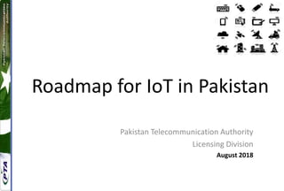 The document outlines the roadmap for the Internet of Things (IoT) in Pakistan, focusing on its economic contributions, ecosystem, technological frameworks, and regulatory challenges as of August 2018. It emphasizes the role of telecom operators in providing IoT services, discusses comparisons between licensed and unlicensed spectrum for IoT applications, and highlights initiatives from the Government of Pakistan aimed at fostering digital transformation and entrepreneurship in the IT sector. The document also addresses existing licensing frameworks and the need for modifications to encourage a broader range of IoT services beyond vehicle tracking.
