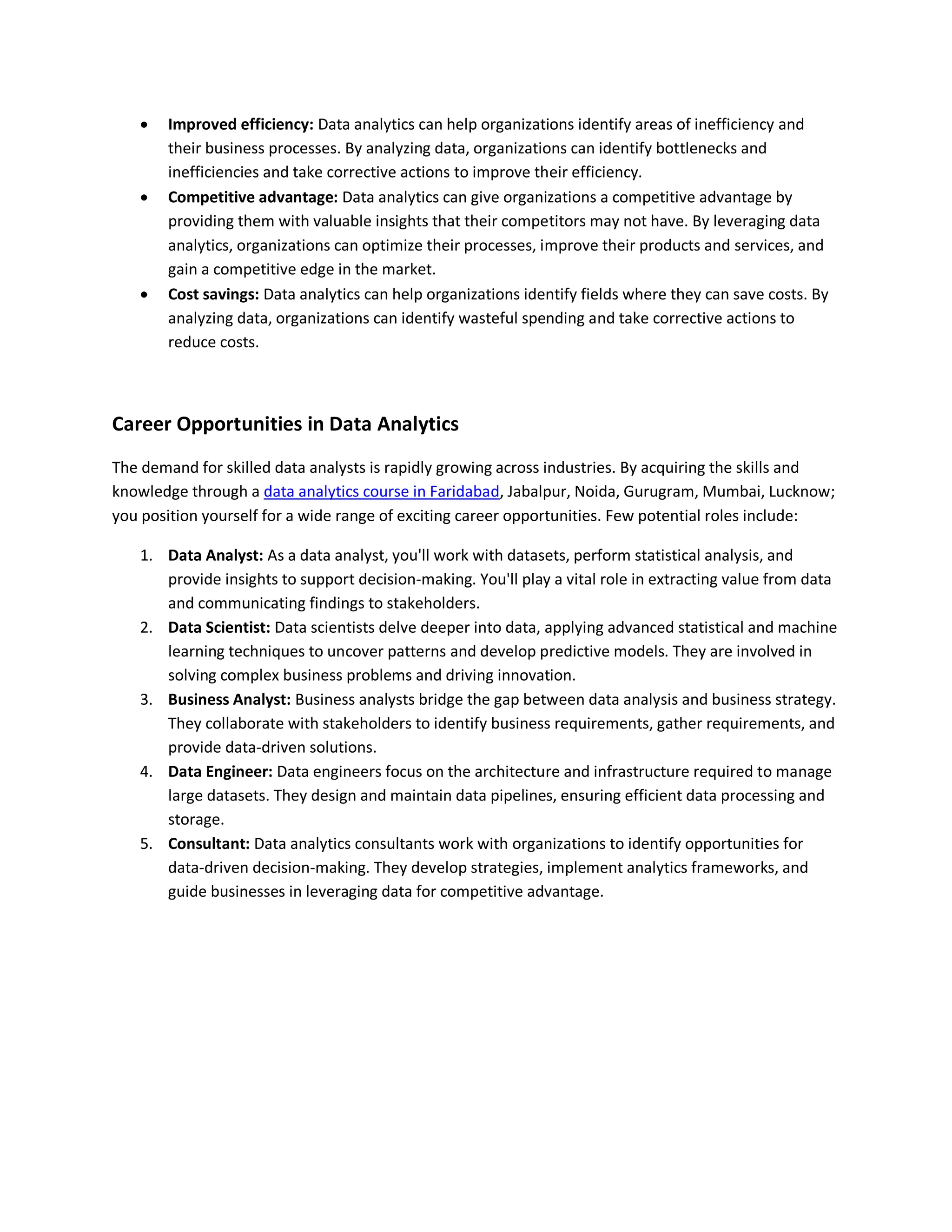 The document discusses the growing field of data analytics, emphasizing the increasing demand for skilled data analysts across various industries, including healthcare and finance. It outlines the benefits of data analytics for organizations such as improved decision-making, efficiency, competitive advantage, and cost savings, while exploring various career opportunities available in this sector. The article also provides guidance on selecting data analytics courses, highlighting the importance of a comprehensive curriculum, experienced instructors, and industry recognition.