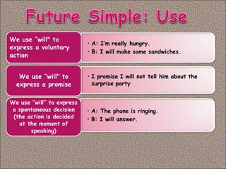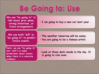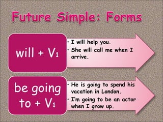 This document provides examples of how to form sentences using future tense verbs in English, including will/won't for predictions and be going to for plans. It shows the positive, negative, and question forms of sentences using she/he/it/we/they/you with will and I/he/she/it/we/they/you with be going to. Examples are given for yes/no questions, wh- questions about location and subjects. The document concludes with exercises for learners to practice future tense constructions.