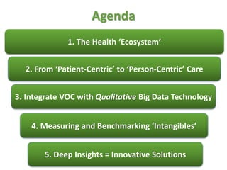 The document discusses using qualitative big data and analytics to gain deep insights into healthcare consumers and stakeholders. It outlines how integrating voice of customer data with qualitative big data technology can help measure intangible factors and benchmark patient and staff experiences. This enables innovative solutions by understanding behaviors at a deeper, psycho-emotional level. The presentation provides examples of how qualitative analytics have been used to reduce missed GP appointments and improve hospital staff morale surveys.