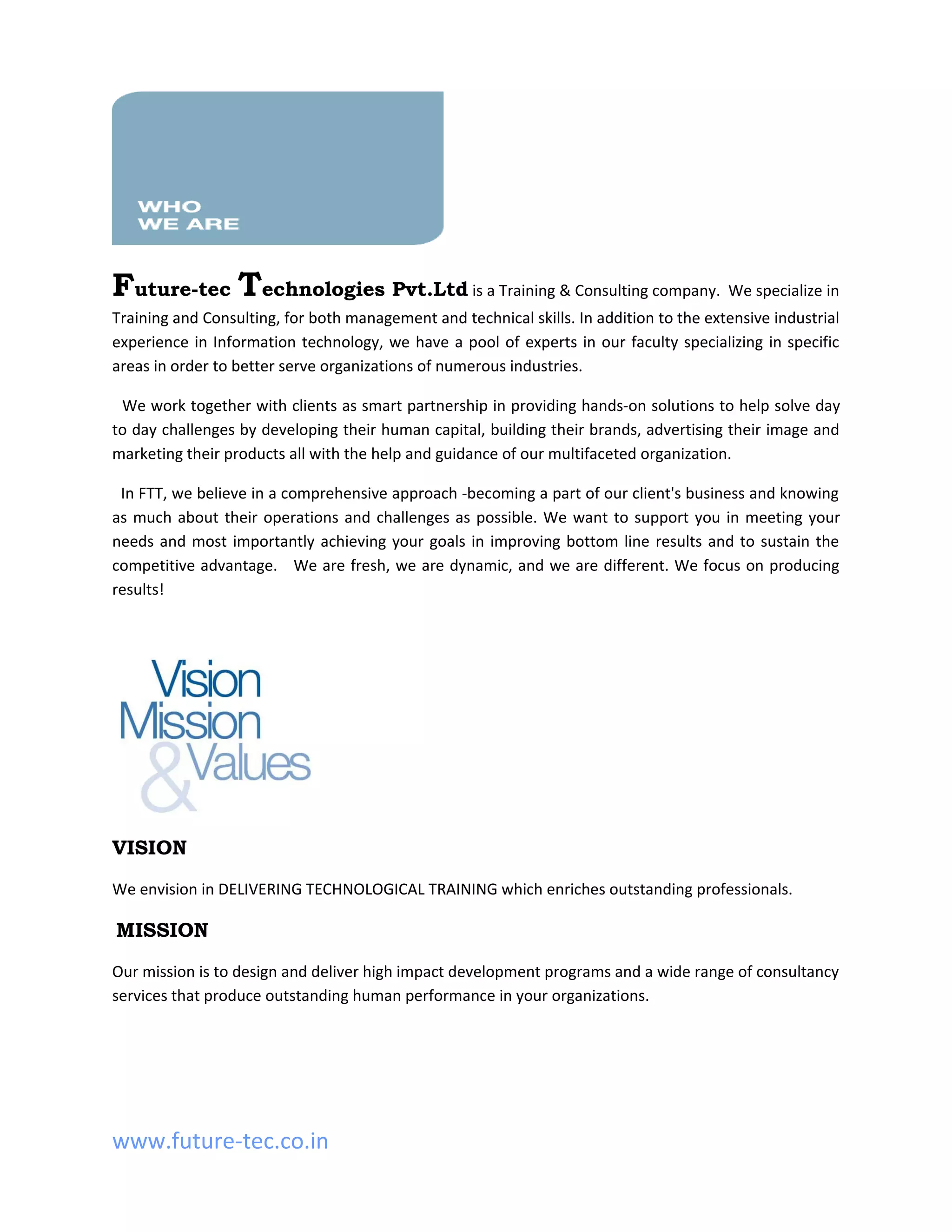 Future-tec Technologies Pvt. Ltd is a training and consulting company that specializes in management and technical skills training. They have a pool of experts in different areas to serve organizations across industries. Their goal is to help clients achieve their goals through human capital development, branding, and marketing assistance. They believe in comprehensive support through training and consultation to improve clients' bottom lines and competitive advantages.