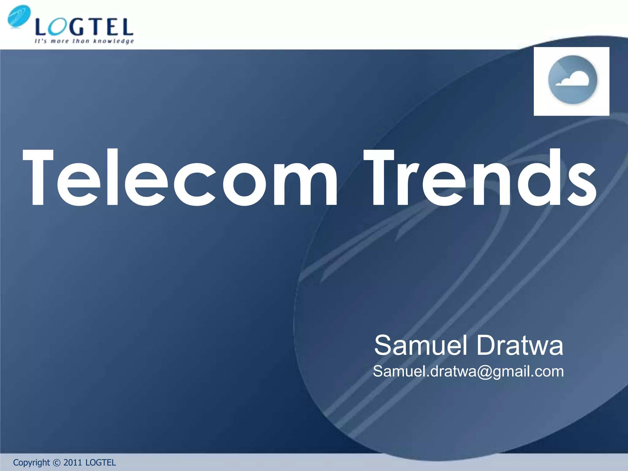 The document discusses various trends in telecommunications including network, service, screen, customer, payment, and vendor convergence. It describes how networks are becoming more integrated using technologies like IP and IMS. Services are converging across devices with fixed-mobile integration and convergence of phones, PCs, and TV. Customers are also converging as business and consumer lines blur. New services enabled by these trends include content delivery networks, location-based services, and community applications.