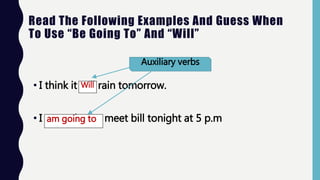 The document explains the differences between using 'going to' and 'will' for future tense in English, including examples and contexts for each usage. It highlights decision-making, predictions, and scheduled events, as well as variations in sentence structure for affirmative, negative, and interrogative forms. Additionally, the document includes practice exercises to reinforce understanding of these concepts.
