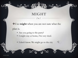 The document discusses various ways to express future tense in English including: might (uncertainty), future simple (promises, predictions, schedules), going to (plans, intentions), present continuous (definite arrangements), future continuous (actions occurring at a specified time), and future perfect (an action completed before a specified time in the future). Examples are provided for each construction along with notes on their meanings and appropriate usage. Time expressions that can be used with each future tense are also outlined.