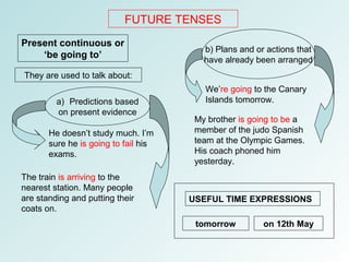 Simple future uses verbs with "will" or "going to" to talk about predictions, wishes, or decisions made in the present. Present continuous or "be going to" express predictions based on present evidence or planned actions. Future continuous uses "will be" plus the -ing form of the verb to describe actions that will be in progress at a specific time in the future. Future perfect uses "will have" plus the past participle to refer to actions that will be finished by a specific time in the future.