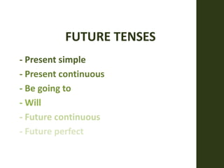 This document summarizes different ways to talk about the future in English including the present simple, present continuous, be going to, will, future continuous, and future perfect tenses. It provides the construction, use, and examples for each future tense.
