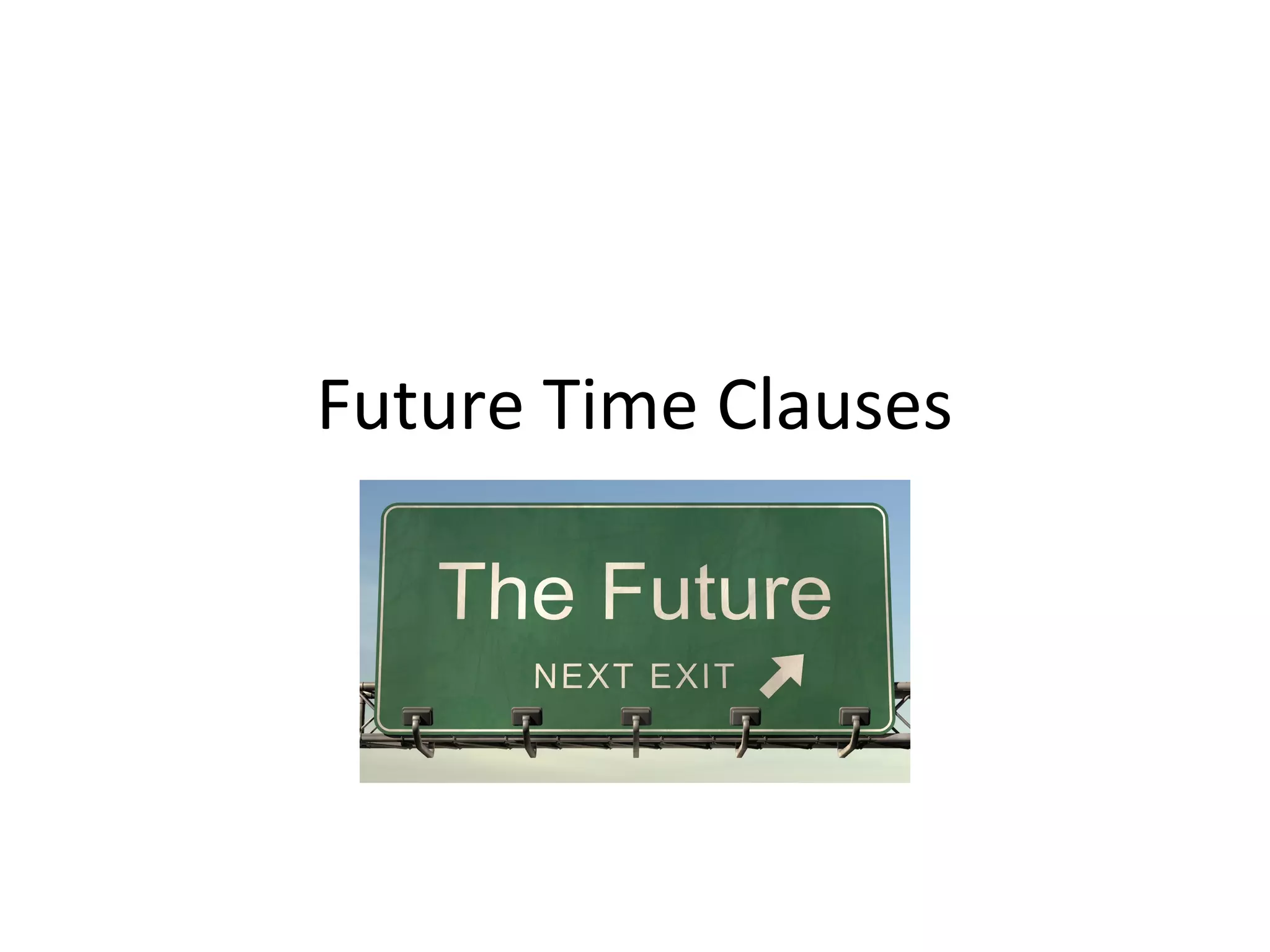 The document discusses future time clauses in English, including the first conditional and future time clauses using words like "when", "as soon as", "in case", "until", "before", and "unless". It provides examples of how to form the first conditional using "if" plus the present tense or modal verbs like "will" and "be going to". It also gives examples of future time clauses used with various time words and pictures to illustrate their meaning.