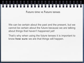 The document discusses different ways to talk about the future in English. It explains the uses of will, be going to, the present continuous, and the present simple to express certainty, plans, predictions, and scheduled events in the future. It also covers using might, may, could, and likely to for less certain predictions. Finally, it discusses using future time clauses with when, after, until, etc. and how the tense changes in the main and time clauses.