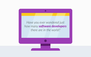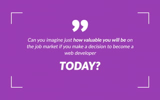 The document discusses the large and growing field of web development. It estimates there are around 18.5 million software developers worldwide, including 11 million professionals and 7.5 million hobbyists. While this number seems large, the demand for new software development jobs each year outstrips the number of computer science graduates, leading to high salaries and demand for web developers. The document encourages the reader to consider a career in web development and provides an overview of front-end and back-end development roles as well as free learning resources for getting started.