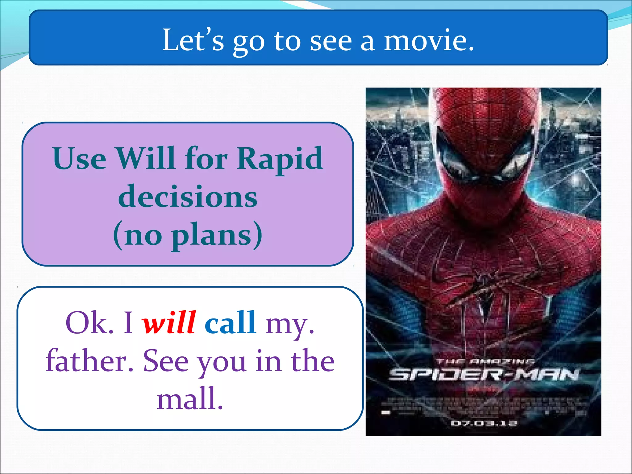 The document is about using will to make predictions, plans, promises and offers. It provides examples of sentences using will for different purposes and confirms the use of will in simple present form for questions.