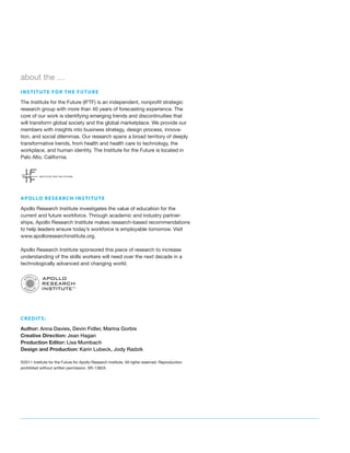 The document discusses future work skills that will be needed over the next decade due to six key drivers of change: extreme longevity, rise of smart machines, computational world, new media ecology, superstructed organizations, and globally connected world. It identifies ten skills that will be critical for the future workforce: sense-making, social intelligence, novel and adaptive thinking, computational thinking, new-media literacy, transdisciplinarity, cultural competency, design mindset, cognitive load management, and virtual collaboration. The skills are mapped to the relevant drivers of change that contribute to their emergence and importance.