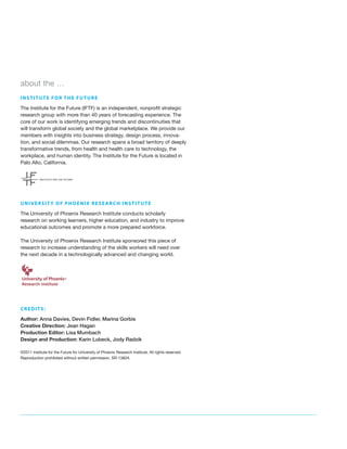 The document discusses future work skills that will be needed over the next decade due to changes in technology and society. It identifies six key drivers of change: 1) Increased longevity, 2) Rise of smart machines, 3) A computational world with increased data and sensors, 4) New media ecologies, 5) Superstructured organizations enabled by social technologies, and 6) An increasingly globally connected world. It then presents ten skills that will be important for future workforces: social intelligence, transdisciplinarity, sense-making, novel and adaptive thinking, computational thinking, virtual collaboration, new media literacy, cross-cultural competency, cognitive load management, and design mindset. The skills are mapped to the relevant drivers to indicate