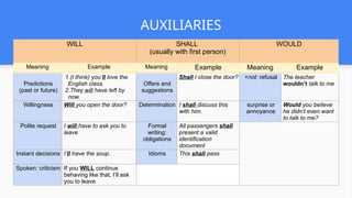 The document discusses the use of advanced auxiliaries 'will', 'shall', and 'would' in English grammar, highlighting their meanings and providing examples. It covers various contexts such as predictions, offers, requests, and formal obligations. Additionally, it touches on idioms and expressions related to these auxiliaries.