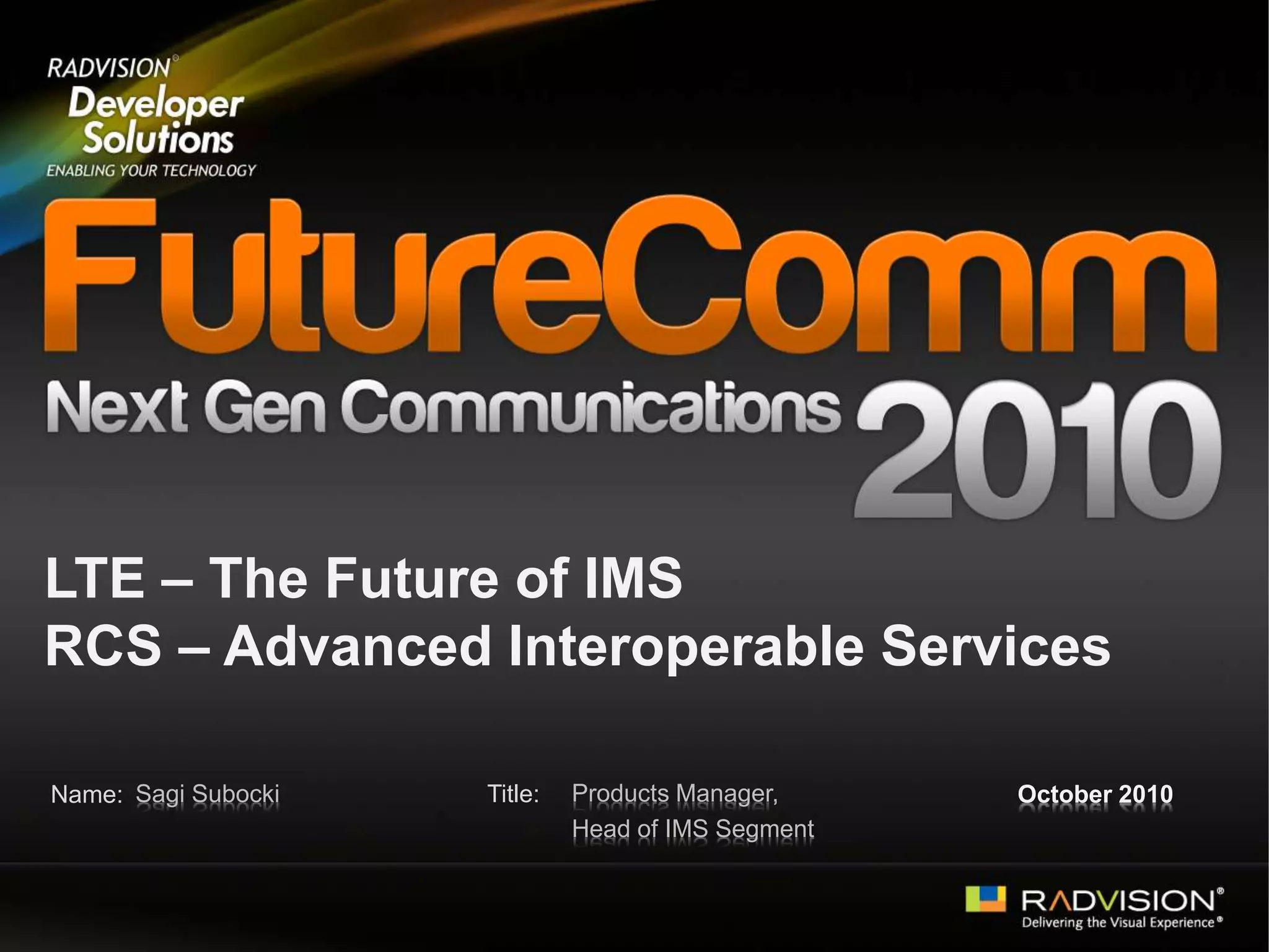 The document discusses LTE and IMS technologies and their role in enabling new voice and messaging services. It introduces VoLTE as a solution for voice over LTE using IMS. IMS is presented as the solution that allows operators to continue providing services over LTE. The document also discusses the Rich Communication Suite (RCS) as an initiative to develop interoperable enriched communication services beyond voice and SMS. RADVISION solutions for IMS and RCS application development are also summarized.