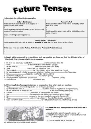 This document provides examples and exercises to practice using different English future tenses: future simple, future progressive, future perfect, and future perfect progressive. It includes examples of when to use each tense as well as fill-in-the-blank and multiple choice exercises for students to complete. The goal is for students to understand how to appropriately use the various English future tense forms to discuss actions and events that will occur or be completed at different points in the future.