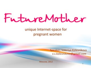 The document proposes creating a unique Internet space for pregnant women to find answers to questions, support, and connect with healthcare specialists. It sees a large market opportunity and proposes a business model supported by ads, services, and marketing research. The team is requesting $100,000 in investment over 6 months to build the platform, develop recommendation systems, attract users and doctors, and provide technical support. The business expects to profit from a large community of pregnant women and doctors, medical recommendations for sale, and being at the forefront of a new healthcare format and genetic medicine.