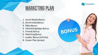 The document outlines a comprehensive marketing plan for the FutureNet platform, detailing various bonuses and income opportunities for active users. Bonuses include social media, multimedia, sales, advertising, and friends bonuses, with a structure that rewards multiple levels of commissions and incentives for team building. Additionally, it describes a career plan with rewards based on points earned through various activities and partnerships.