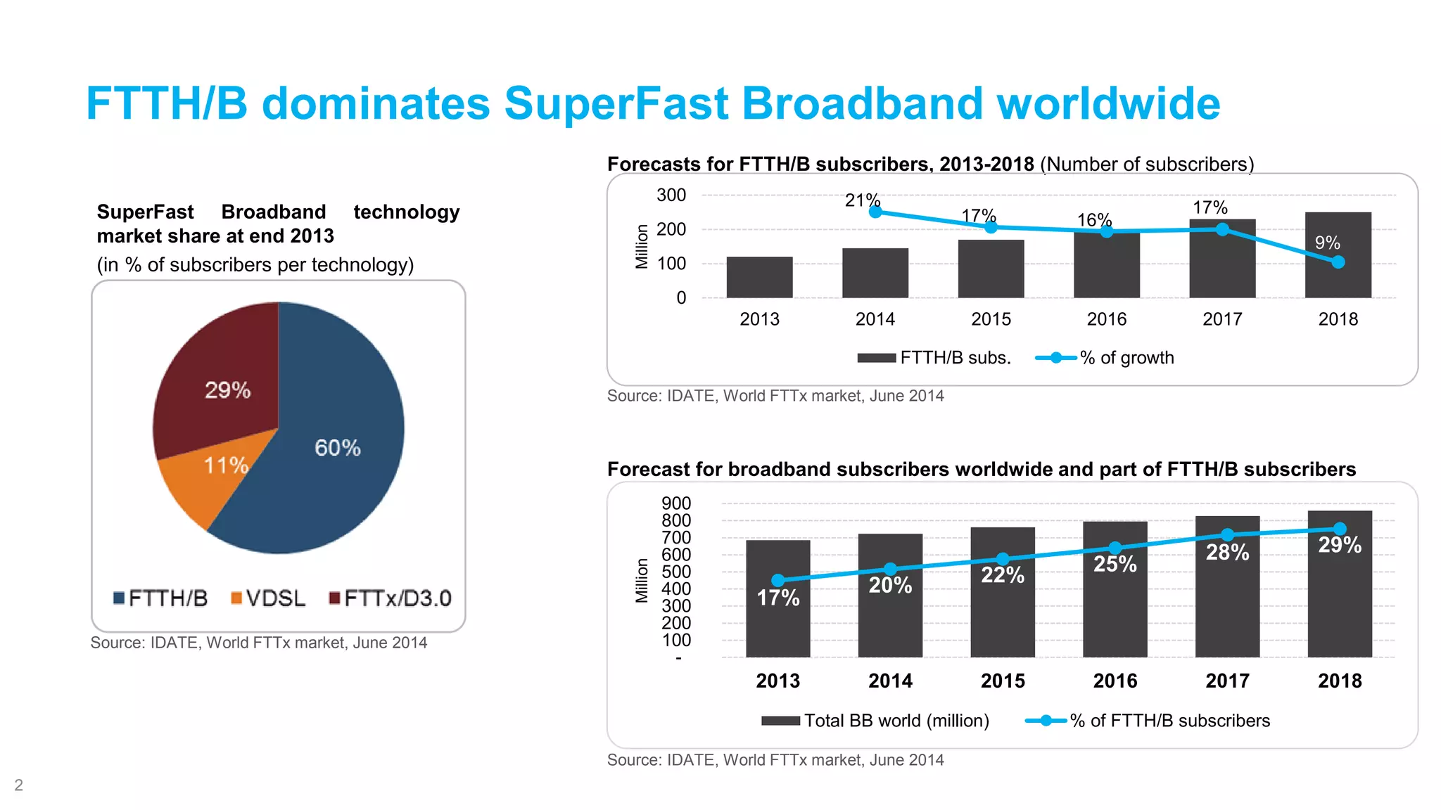 The document discusses the significant growth forecast for Fiber to the Home/Building (FTTH/B) coverage, which is expected to increase from over 363 million homes passed in 2013 to nearly 632 million by the end of 2018. It emphasizes the importance of fiber in mobile backhauling and the rising demand for high-capacity networks, particularly in regions like Asia and North America, while European countries are catching up. Additionally, the document highlights the trend towards integrated fixed and mobile services as operators seek to enhance user experiences through higher data rates and service combinations.