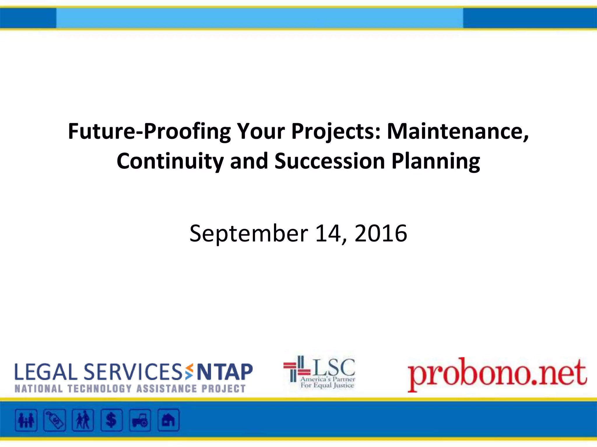 The document outlines key strategies for future-proofing legal technology projects, emphasizing the importance of maintenance, succession planning, and effective communication during staffing transitions. It features insights from various presenters on lessons learned and best practices for managing project transitions, highlighting the need for documentation and knowledge sharing. Resources and tools for facilitating successful transitions and ensuring project continuity are also shared.