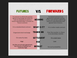 The document outlines the concepts of futures and options, detailing their definitions, characteristics, and various types. Futures contracts obligate buyers and sellers to transact at a specified price on an expiration date, while options provide the right, but not the obligation, to buy or sell a specific security before a given expiration date. It includes examples of stock futures, call options, and put options, illustrating how they operate and their respective financial implications.