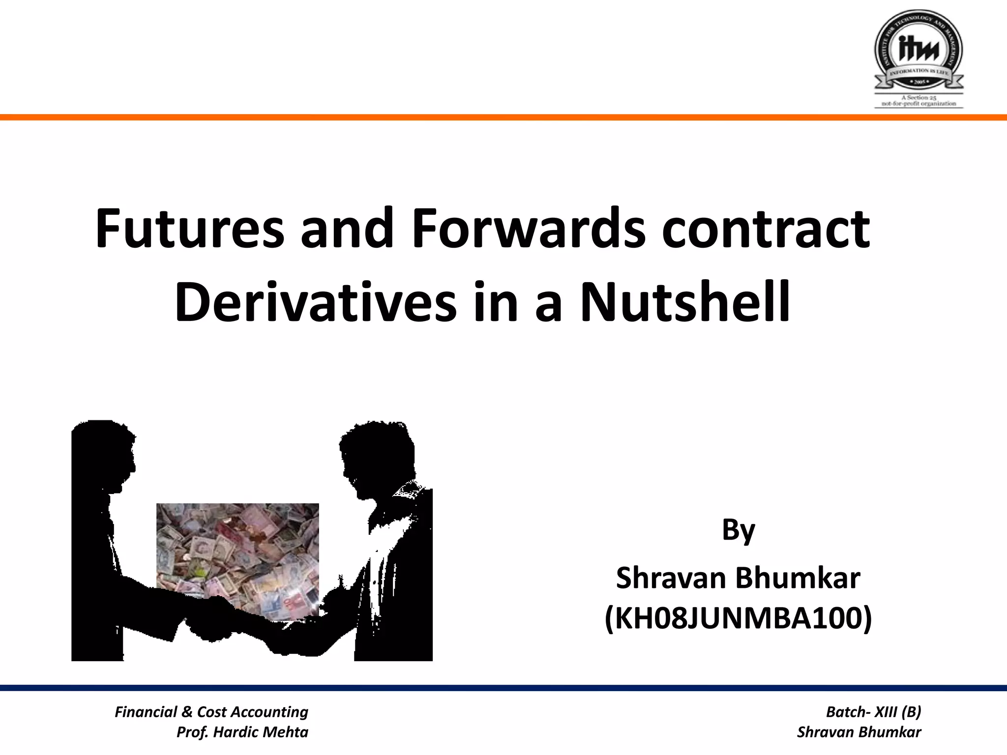 Futures and forwards contracts are types of derivatives that allow parties to lock in a price for an asset to be exchanged at a future date. A forward contract is a customized over-the-counter agreement between two parties, while a futures contract is standardized and traded on an exchange. Key differences are that futures contracts have daily margin settlements and lower counterparty risk. Derivatives are used by hedgers to manage risk, speculators to wager on price movements, market-makers to facilitate trading, and arbitrageurs to exploit temporary price differences across markets.