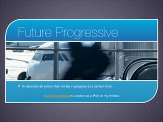 The document discusses the future progressive and future perfect tenses in English. The future progressive is used to describe actions that will be in progress at a certain time, such as "I will be working in London as a Pilot in my thirties." The future perfect is used to describe events that will be finished by a certain time, like "I will have become a Pilot by the time I'm 28 years old." Examples are provided and exercises ask learners to fill in blanks using the future tenses.