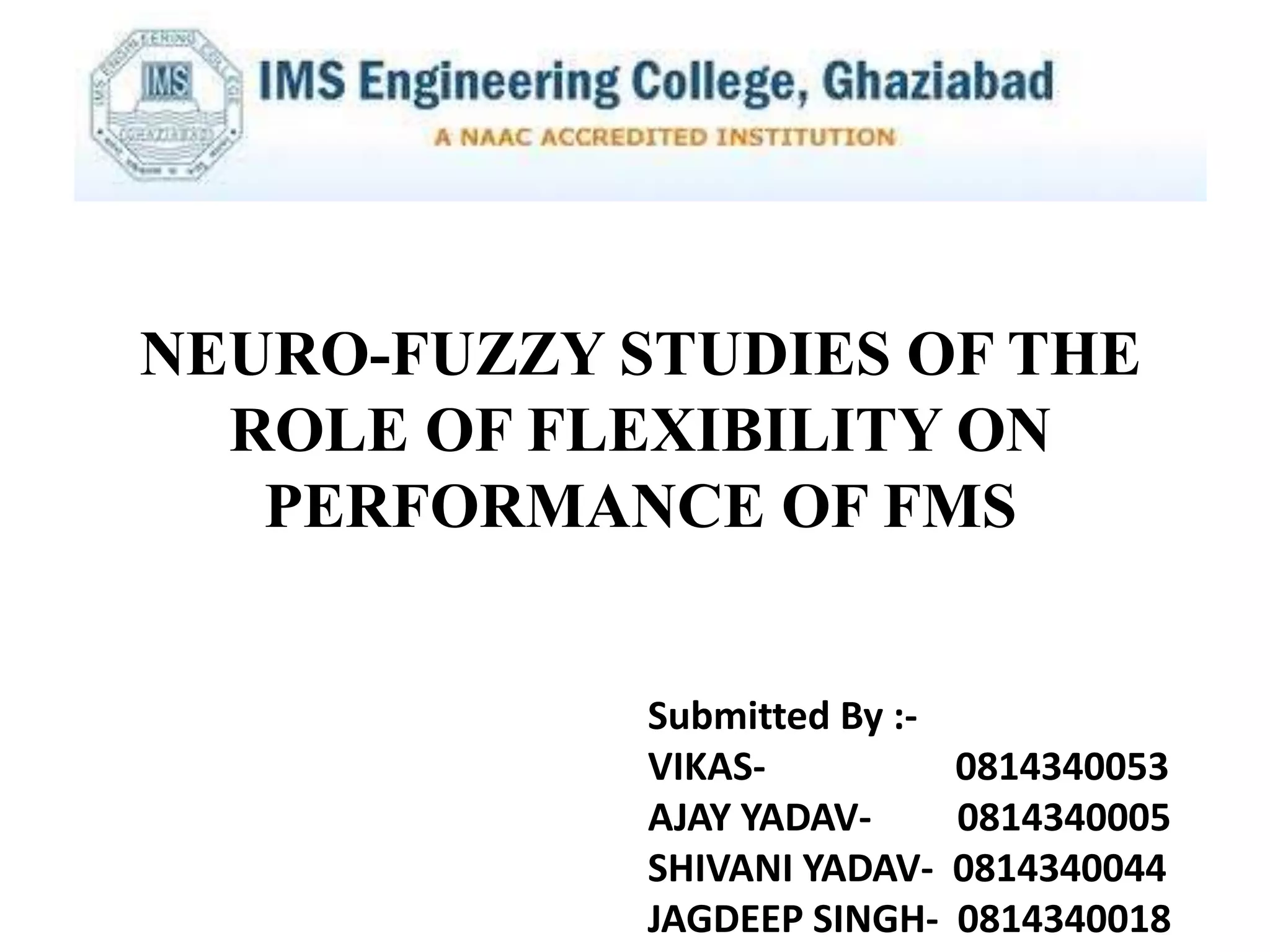 This document discusses using neuro-fuzzy techniques to study the role of flexibility in flexible manufacturing systems (FMS) performance. It provides an implementation plan involving literature reviews on FMS, artificial intelligence, and neuro-fuzzy systems. The methodology will involve collecting data, experimenting with adaptive neuro-fuzzy inference systems (ANFIS), and analyzing the results. The expected outcomes are cost-effective solutions for Indian industries that can offer flexibility like FMS systems through fuzzy logic decision making.