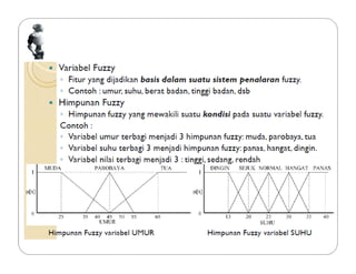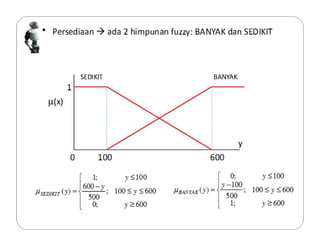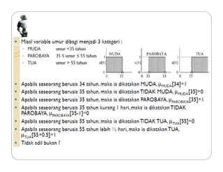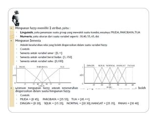 Dokumen tersebut membahas tentang logika fuzzy, termasuk pengertian dasar, konsep-konsep kunci, dan aplikasinya dalam berbagai bidang seperti otomatisasi, medis, dan manajemen. Logika fuzzy pertama kali dikembangkan oleh Lotfi Asker Zadeh pada tahun 1965 untuk menangani masalah yang mengandung ketidakpastian."