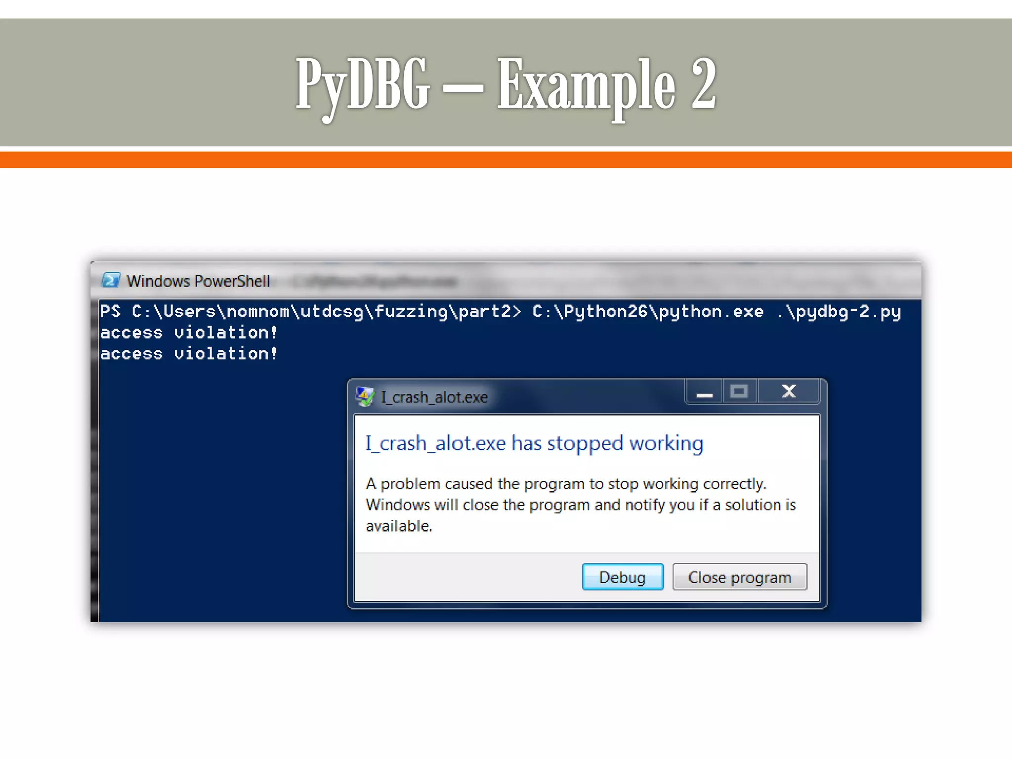 The document discusses tools and techniques for debugging and fuzzing applications on Windows, primarily focusing on pydbg and winappdbg. It outlines their capabilities such as process manipulation, memory access, and automation for tasks like malware analysis and crash handling. Furthermore, design goals for fuzzer development are highlighted, emphasizing modularity, reusability, and the importance of code coverage in enhancing fuzzing effectiveness.
