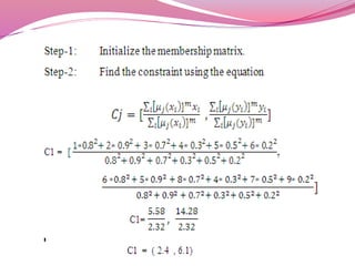 Fuzzy C-means is an extension of k-means clustering that allows data points to belong to multiple clusters simultaneously. It assigns a membership value between 0 and 1 to each data point for each cluster, indicating the likelihood of membership. The example demonstrates fuzzy C-means clustering on a dataset with 6 data points and 2 clusters, calculating the membership values and distances over multiple iterations until the cluster centroids stabilize.