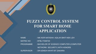This document proposes a fuzzy control system for smart home applications. The system would allow users to control home appliances like lights, air conditioning, and kitchen appliances remotely using a mobile application. It would use a Raspberry Pi as the central controller connected to sensors and devices. The system would employ fuzzy logic and communicate over WiFi to allow users to control devices from their phones. The goals of the project are to design and implement a smart home system that can control appliances anywhere and anytime to help people with disabilities.