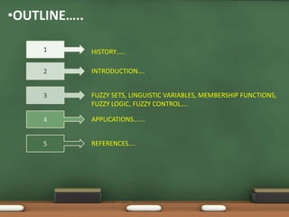 Fuzzy logic, introduced by Lotfi Zadeh in 1965, allows for partial set membership rather than strict true/false definitions, facilitating data processing akin to human reasoning. Applications of fuzzy logic range from controlling subway systems to automating vehicles and various household technologies, enhancing system performance and decision-making. The methodology involves fuzzification, rule evaluation, and defuzzification to translate human-like reasoning into machine actions.