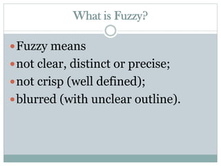 The document discusses fuzzy sets and fuzzy logic. It defines fuzzy as meaning not clear or precise, with blurred outlines. Fuzzy sets allow partial membership in a set, whereas classical sets have binary membership. Fuzzy sets are represented by membership functions that can take on values between 0 and 1. Common fuzzy set operations like union, intersection, and complement are defined. Fuzzy logic is then introduced as a way to represent imprecise concepts and approximate reasoning, extending conventional binary logic to allow intermediate truth values.