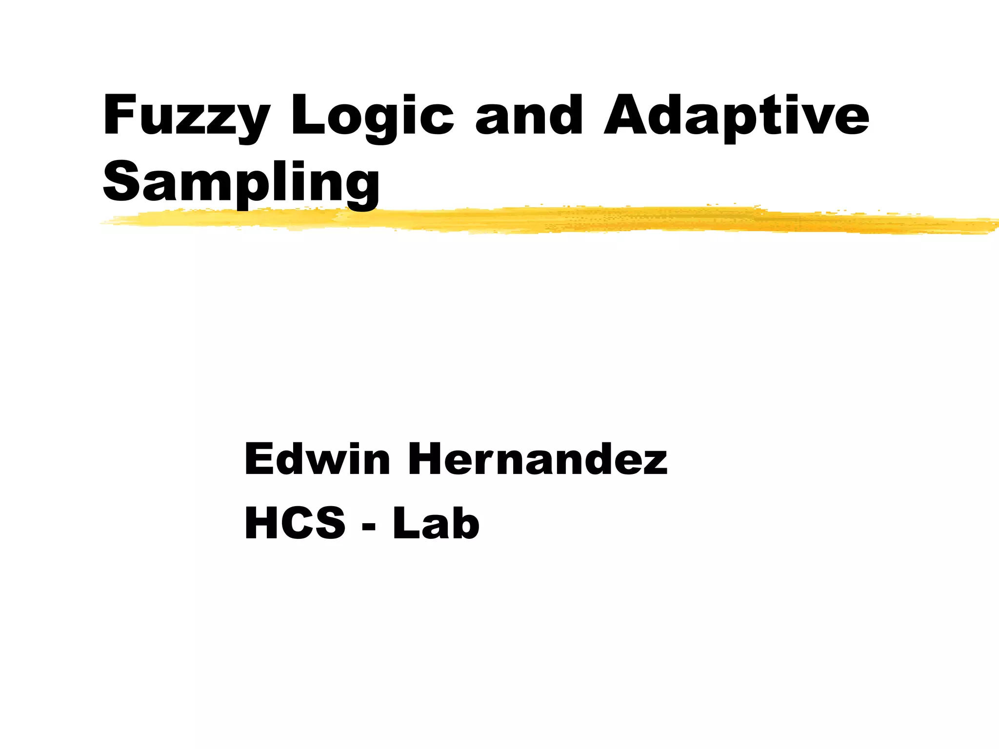 The document discusses fuzzy logic and its application to adaptive sampling. It introduces fuzzy logic concepts like membership functions and defines membership functions used for variables like deltaV and deltaT. It then outlines 25 rules for the fuzzy logic controller and describes different inference methods like MAX-MIN, MAX-DOT and averaging that can be used to process the rules. The fuzzy logic controller is applied to adaptive sampling to dynamically adjust sampling based on changes in deltaV and deltaT.