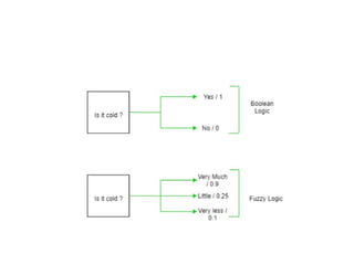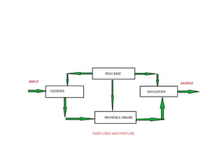 Fuzzy logic is a form of many-valued logic that allows for reasoning with imprecise or uncertain information, utilizing truth values between 0 and 1. It employs membership functions and fuzzy rules to model vagueness in decision-making across various applications, including control systems and artificial intelligence. The architecture of fuzzy logic systems consists of components such as rule bases, fuzzification, inference engines, and defuzzification to process input data and generate outputs.