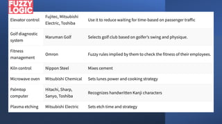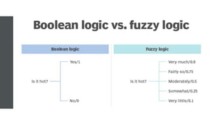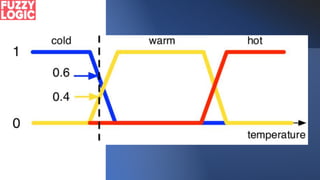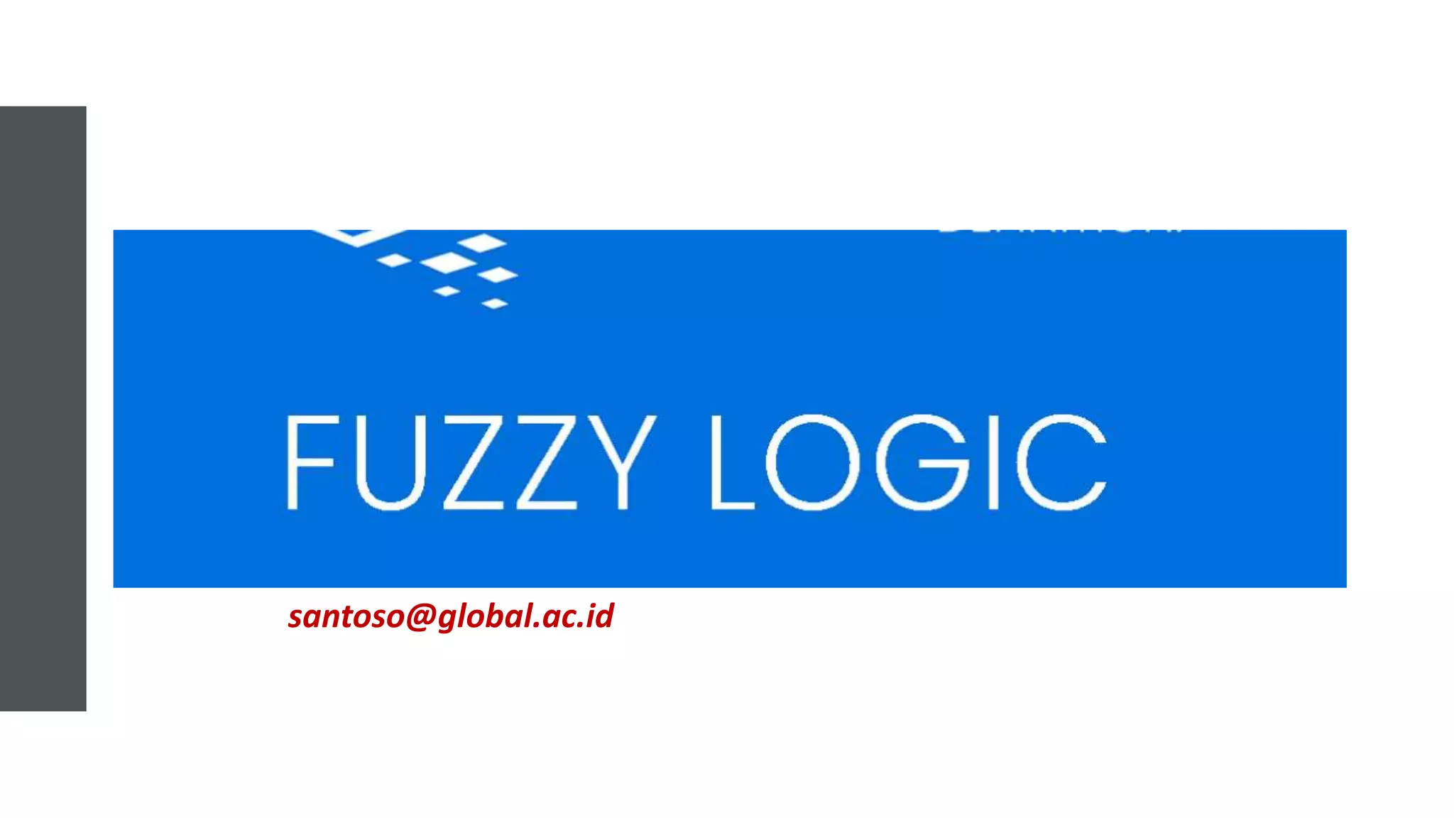 Logika fuzzy adalah bentuk logika bernilai banyak dimana nilai kebenaran variabel dapat berupa bilangan real antara 0 dan 1, berbeda dengan logika Boolean yang hanya memiliki nilai 0 atau 1. Logika fuzzy digunakan untuk menangani konsep kebenaran parsial dan telah diterapkan pada berbagai bidang seperti teori kontrol, kecerdasan buatan, dan lainnya.