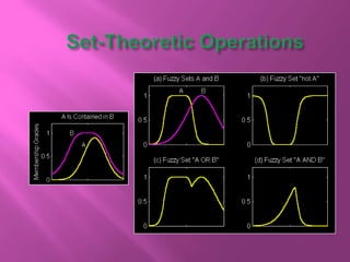 The document discusses fuzzy sets and their characteristics, including membership functions (MF), fuzzy numbers, and specific types of MFs like triangular, trapezoidal, and Gaussian. It highlights the formal definitions of fuzzy sets, the concepts of support, core, and convexity, as well as operations such as subset, complement, union, and intersection. Additionally, various methods for calculating fuzzy sets and their properties are described, alongside examples demonstrating their applications.