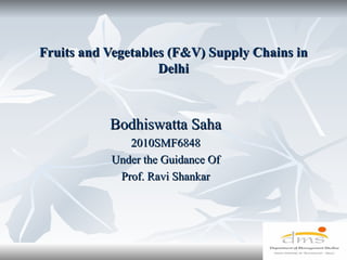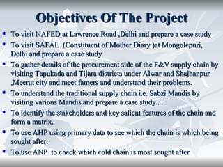 The document discusses the objectives and outline of a project studying fruit and vegetable supply chains in Delhi. The project aims to study organizations like NAFED and SAFAL, traditional wholesale markets, and procurement from farmers. It will identify stakeholders, use analytical tools like AHP and ANP to evaluate different supply chains, and draw conclusions. Site visits will be conducted to collect case studies and understand challenges farmers face selling to these organizations.