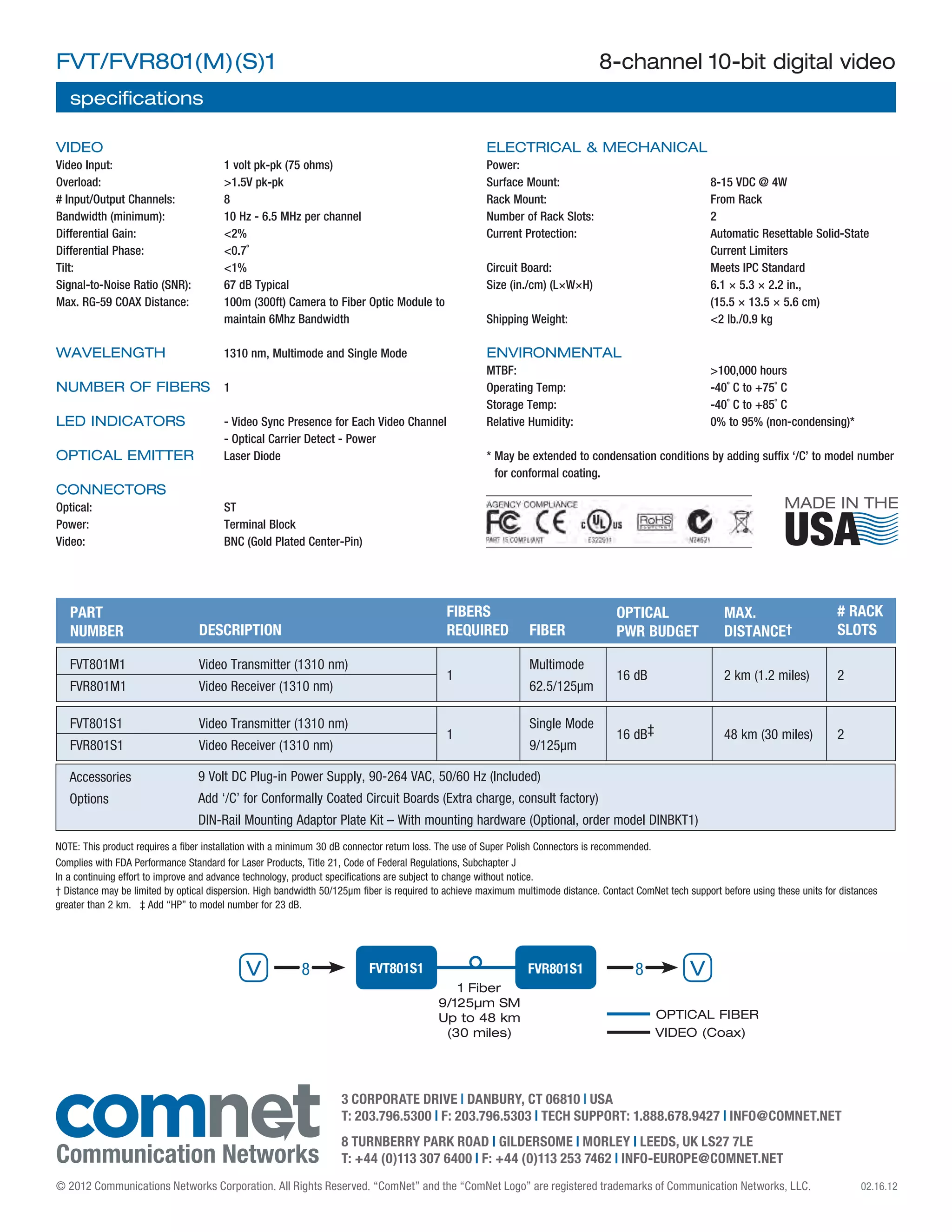 The document describes the Comnet FVT/FVR801 series, which are 10-bit digital video transmitters and receivers capable of transmitting eight independent video channels over a single optical fiber. These units are designed for high-quality, reliable video transmission in unconditioned environments and include features such as bi-color LED indicators and voltage transient protection. They comply with various environmental standards and are suitable for applications like high-performance CCTV.