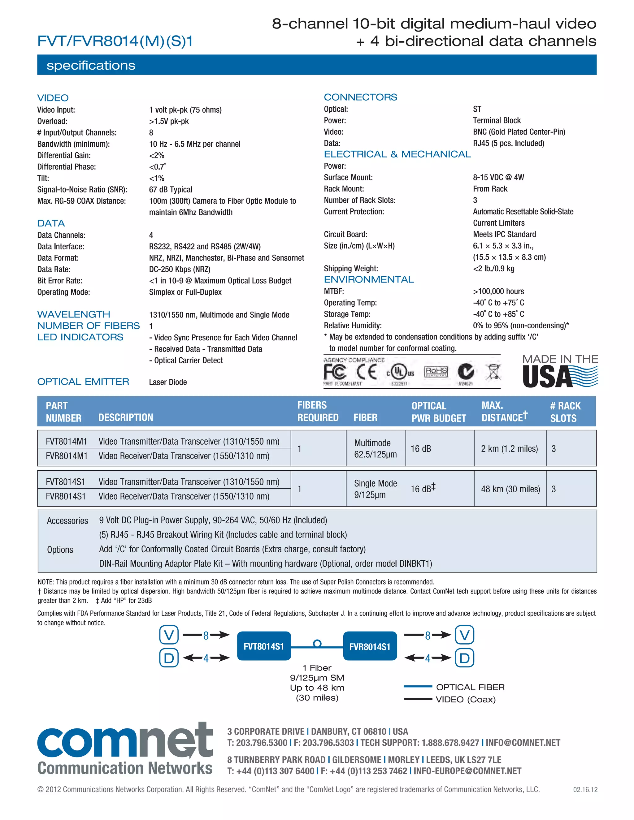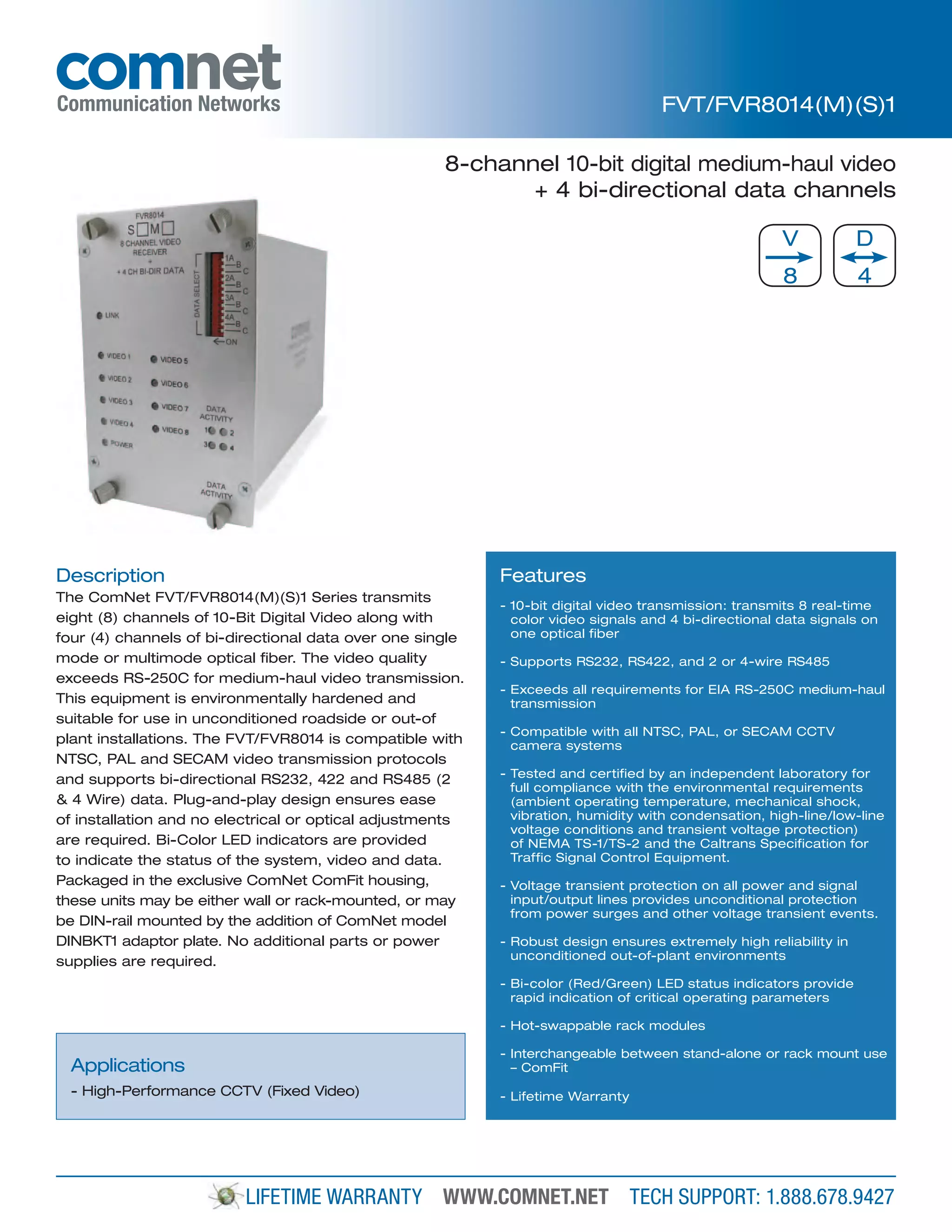 The Comnet FVT/FVR8014(m)(s)1 series transmits 8 channels of 10-bit digital video and 4 bi-directional data channels over optical fiber, offering high-quality medium-haul video transmission that complies with various standards. It features a plug-and-play design for easy installation, robust environmental protection, and compatibility with different video transmission protocols. Additionally, it includes bi-color LED indicators for system status and is suitable for both stand-alone and rack-mounted configurations.