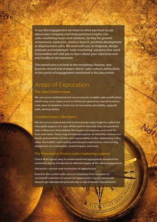 The document outlines a discovery session with Fortunewest focused on enhancing sales and marketing strategies by understanding client objectives, diagnosing challenges, and providing tailored solutions. Key components include analyzing buyer types, assessing current sales processes, and reviewing competitive positioning to refine marketing messages. The intended outcomes involve detailed reports and recommendations aimed at improving sales culture, conversion rates, and overall business impact.