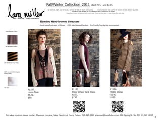 This document provides information on the Fall/Winter 2011 collection from Found Future, including contact information, product details, pricing, and ordering terms. It lists sweaters and other items made of bamboo, recycled cotton, and bamboo/cotton blends. Sweaters are hand-loomed and sewn in Chicago. A non-refundable 30% deposit is required, as items are made to order. Returns are not allowed but exchanges can be made within 10 days of receipt. Shipping takes 6 weeks from order date.
