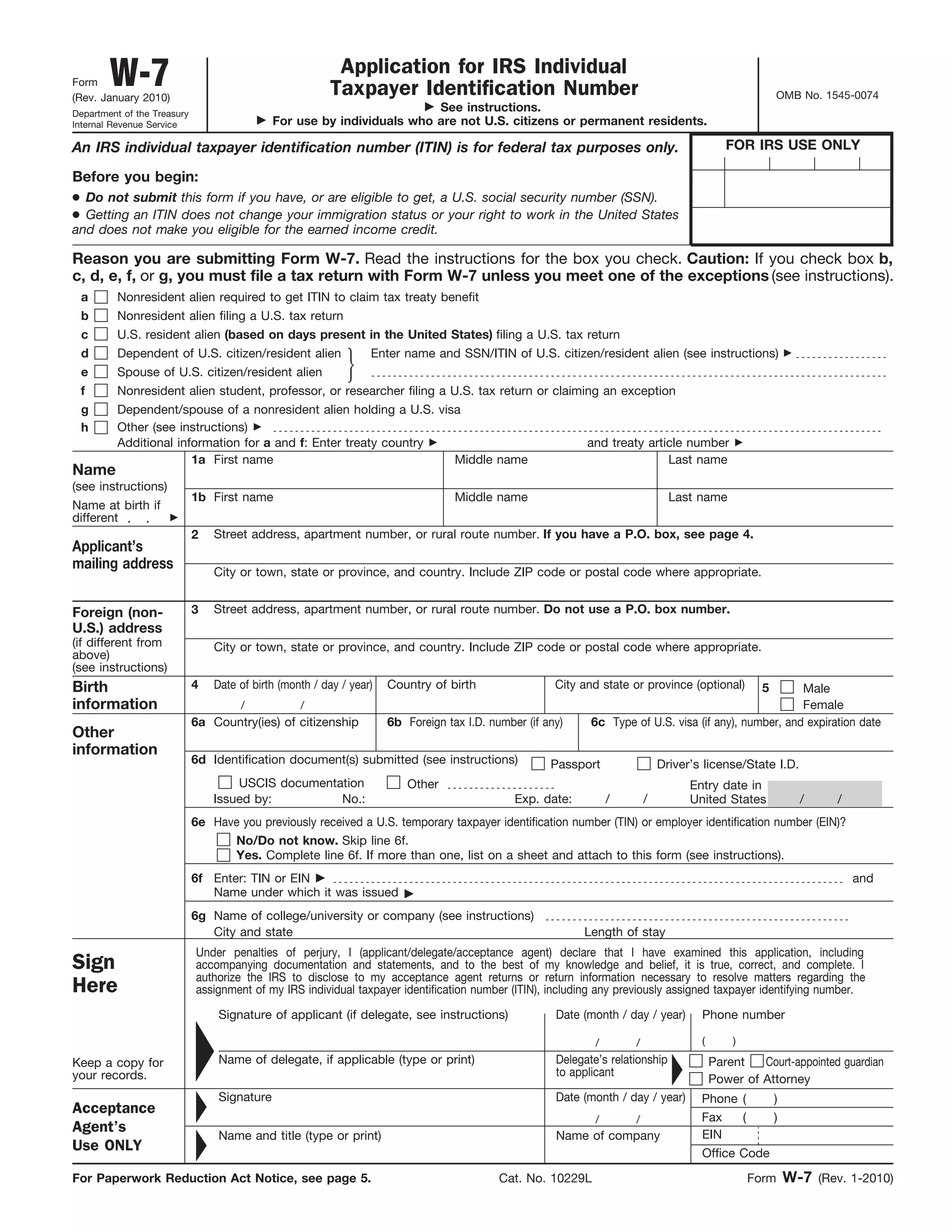 The Form W-7 is an application for an Individual Taxpayer Identification Number (ITIN) from the IRS that is used by individuals who are not U.S. citizens or permanent residents to file a U.S. tax return. The form collects information such as the applicant's name, address, date of birth, country of citizenship, visa information if applicable, and tax filing reasons in order to apply for an ITIN. Applicants must sign the form under penalty of perjury to authorize the IRS to disclose return information as needed to process the ITIN application.